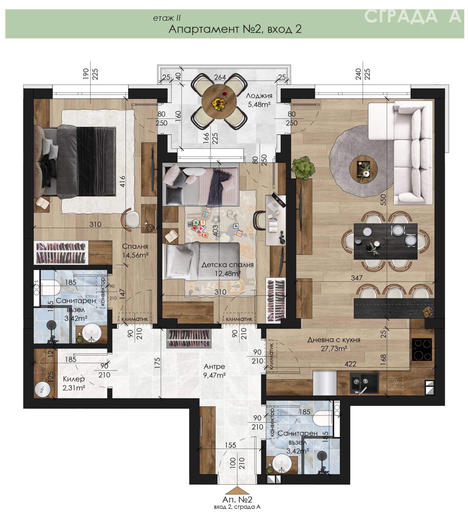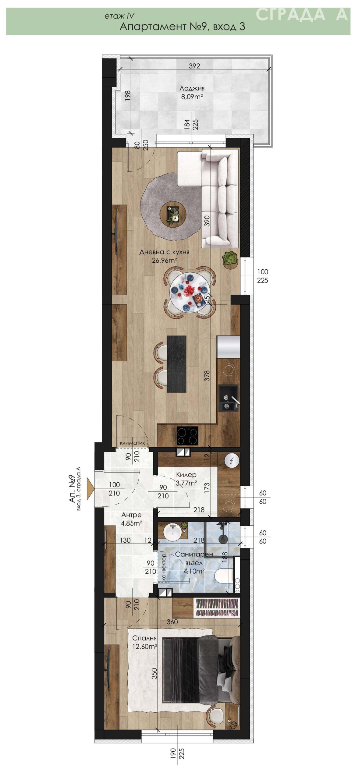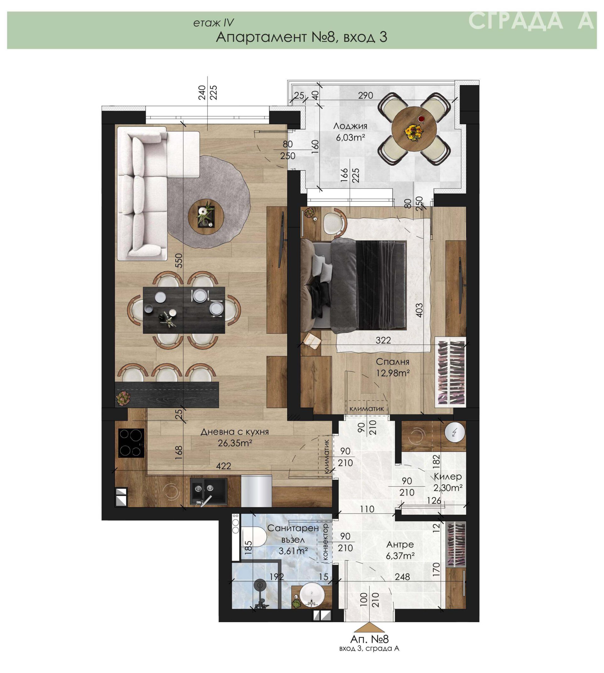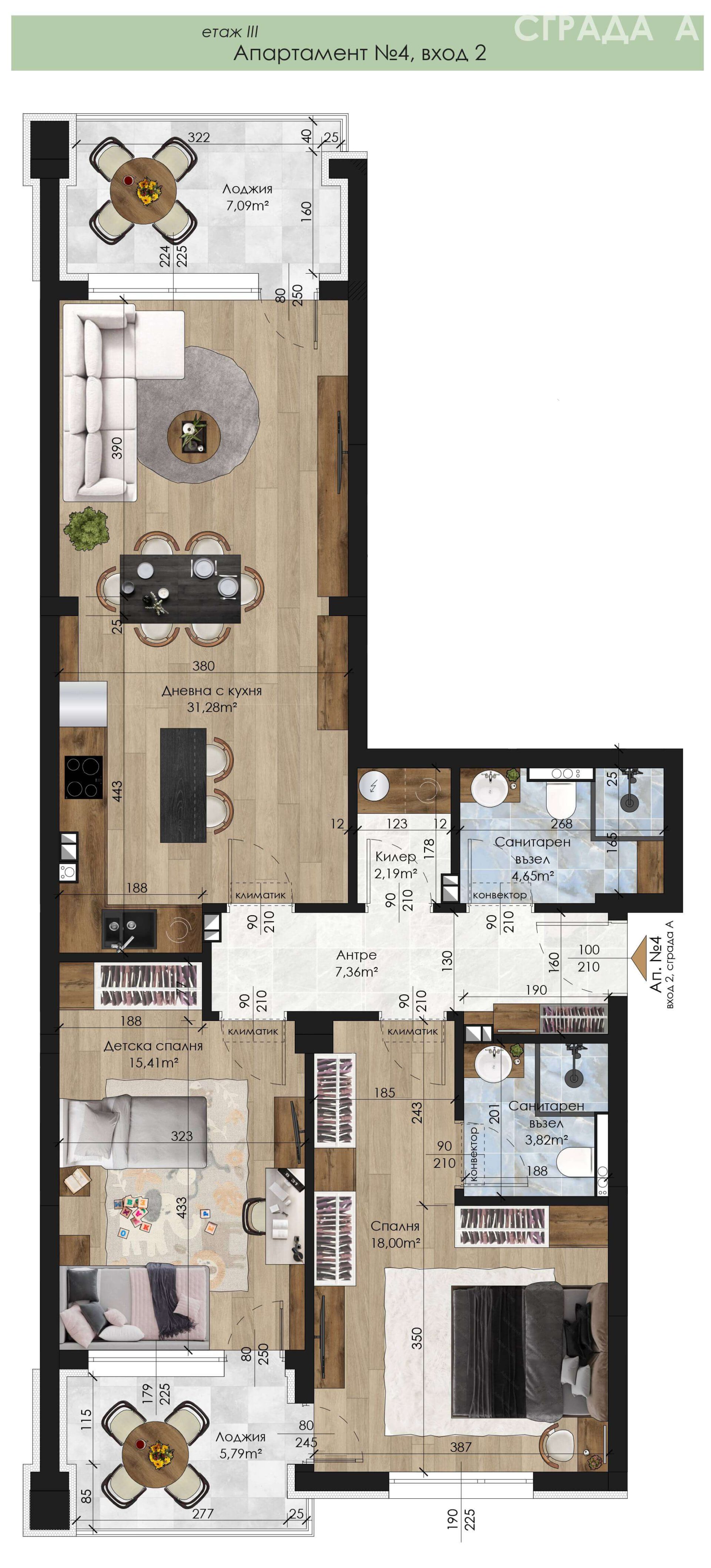 Сграда А е разделена на три входа и включва 40 апартамента. Допълнително има 6 търговски помещения, които добавят удобство за ежедневни услуги „на място“. Паркирането е решено с подземни гаражи, което помага зоните около комплекса да останат по-подредени. Това е сградата в „Ривиера“, която комбинира жилищна среда и активна функционалност.