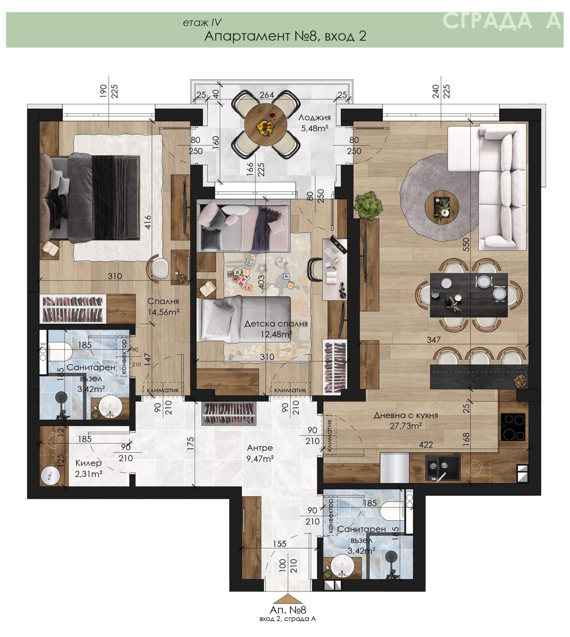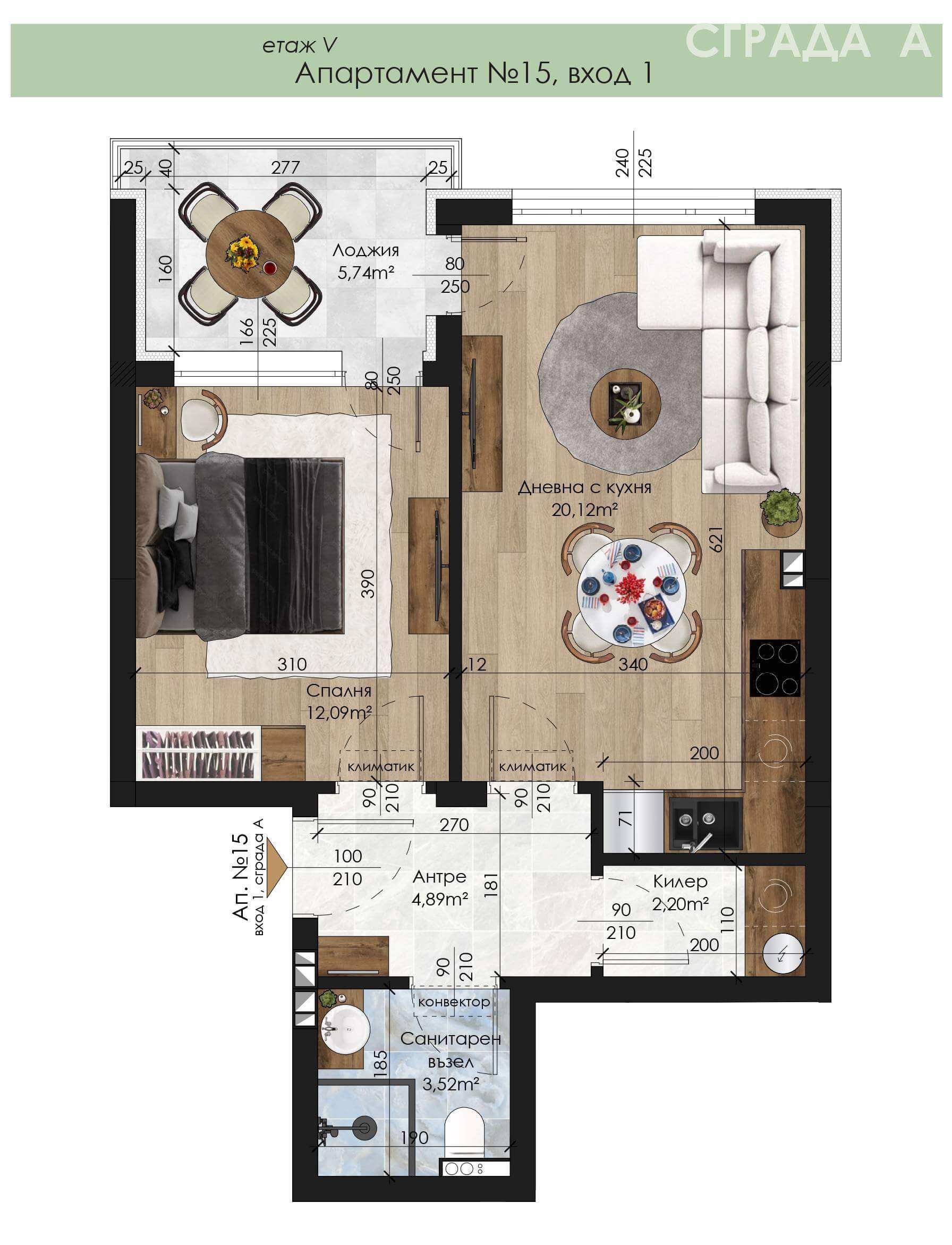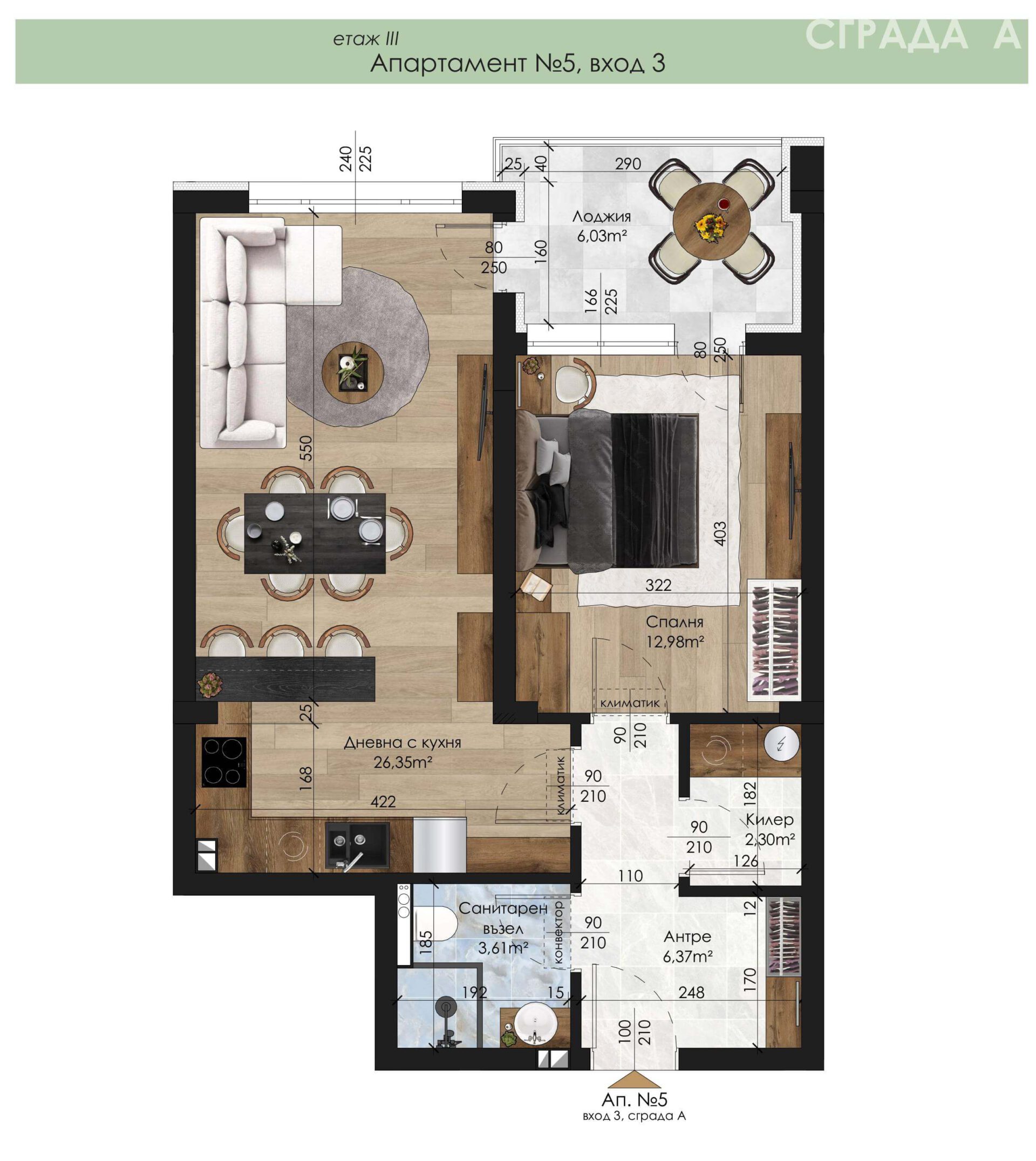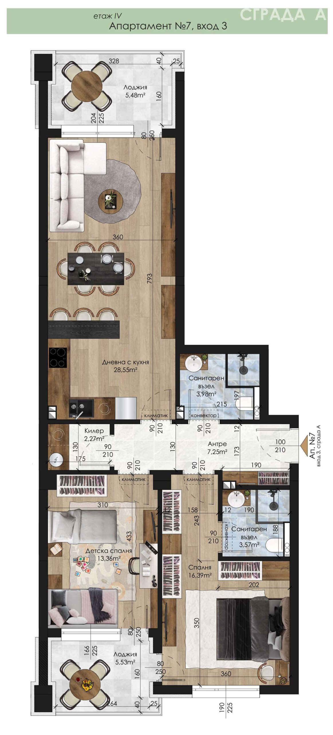 Сграда А е разделена на три входа и включва 40 апартамента. Допълнително има 6 търговски помещения, които добавят удобство за ежедневни услуги „на място“. Паркирането е решено с подземни гаражи, което помага зоните около комплекса да останат по-подредени. Това е сградата в „Ривиера“, която комбинира жилищна среда и активна функционалност.