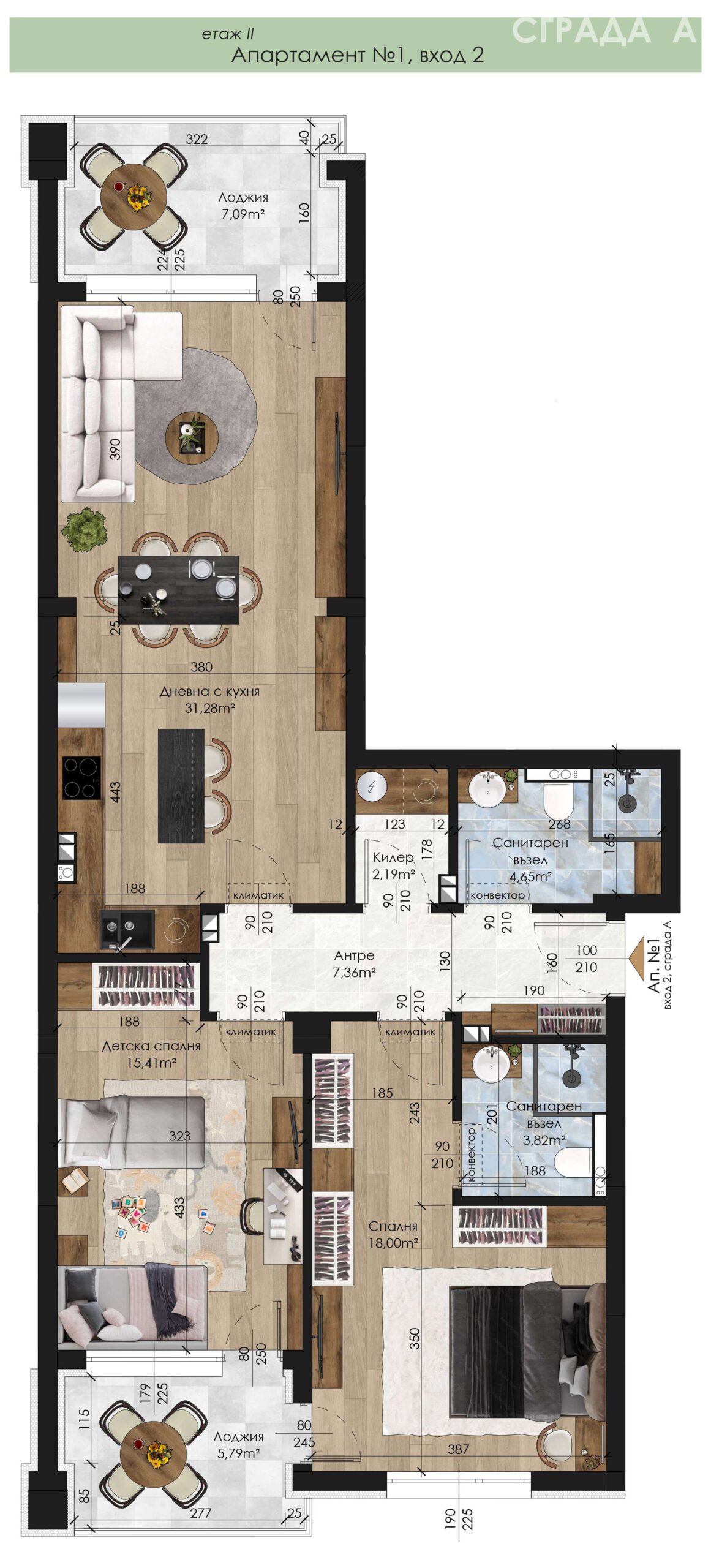 Апартамент – дневна с кухненски бокс, 2 спални, 2 санитарни възела, килер, антре и 2 лоджии.