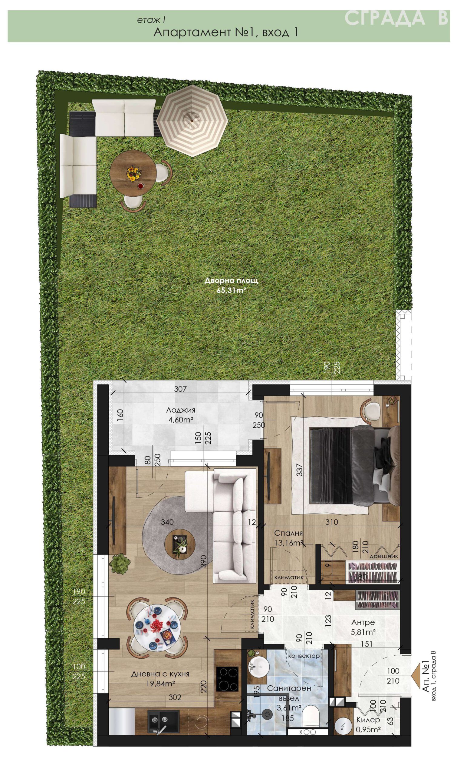 Апартамент – дневна с кухненски бокс, спалня, санитарен възел, дрешник, килер, антре, лоджия и 65,31 кв.м двор.