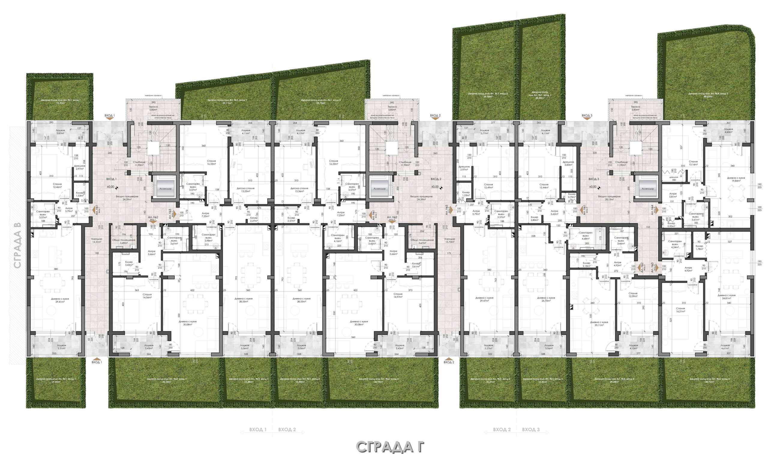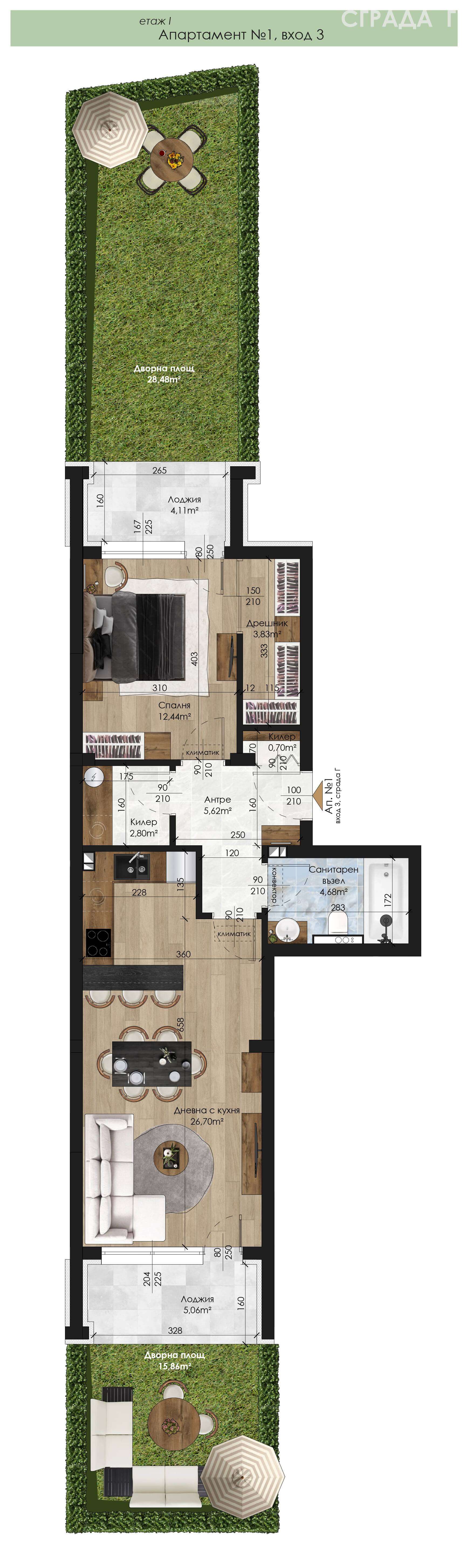Апартамент – дневна с кухненски бокс, спалня, санитарен възел, дрешник, килер, антре, 2 лоджии и 44,34 кв.м двор.