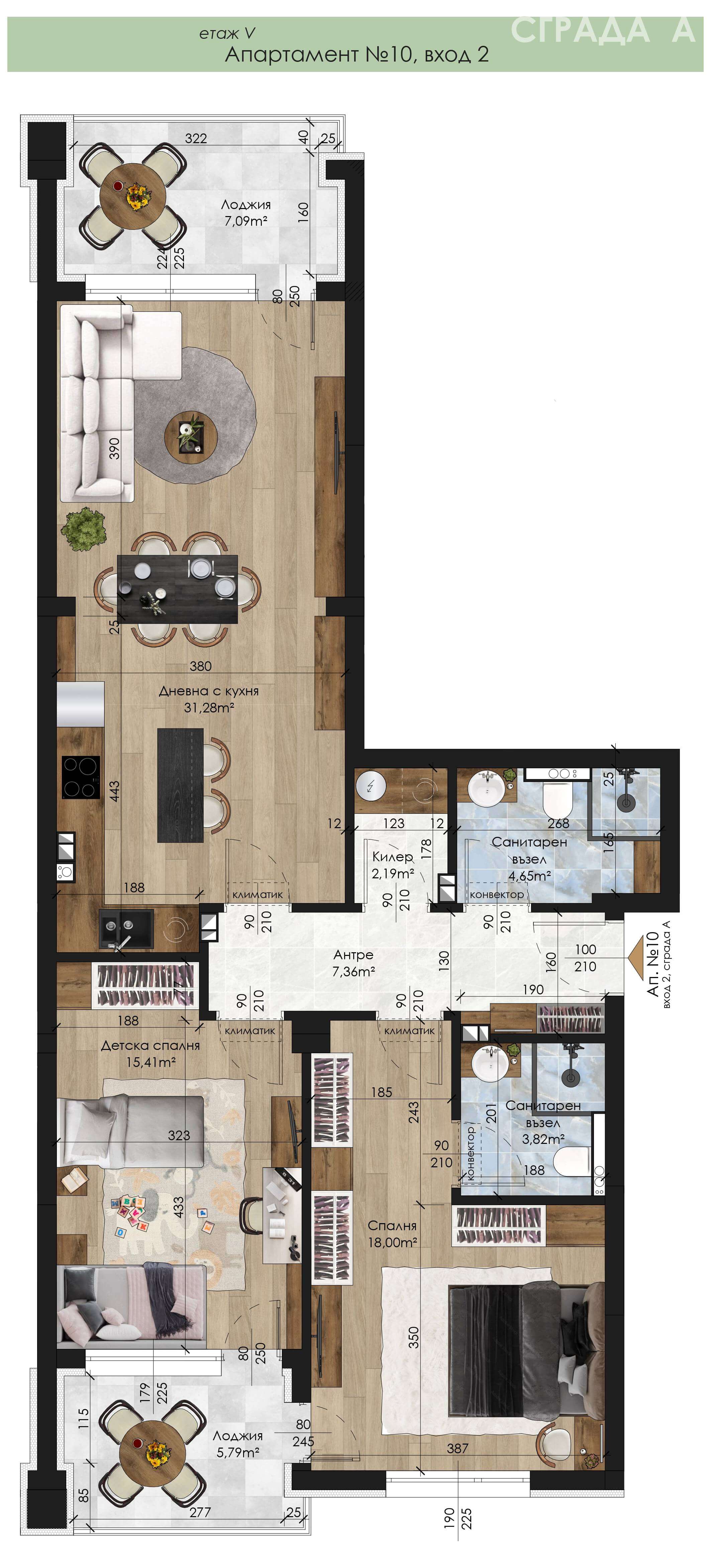 Апартамент – дневна с кухненски бокс, 2 спални, 2 санитарни възела, килер, антре и 2 лоджии.