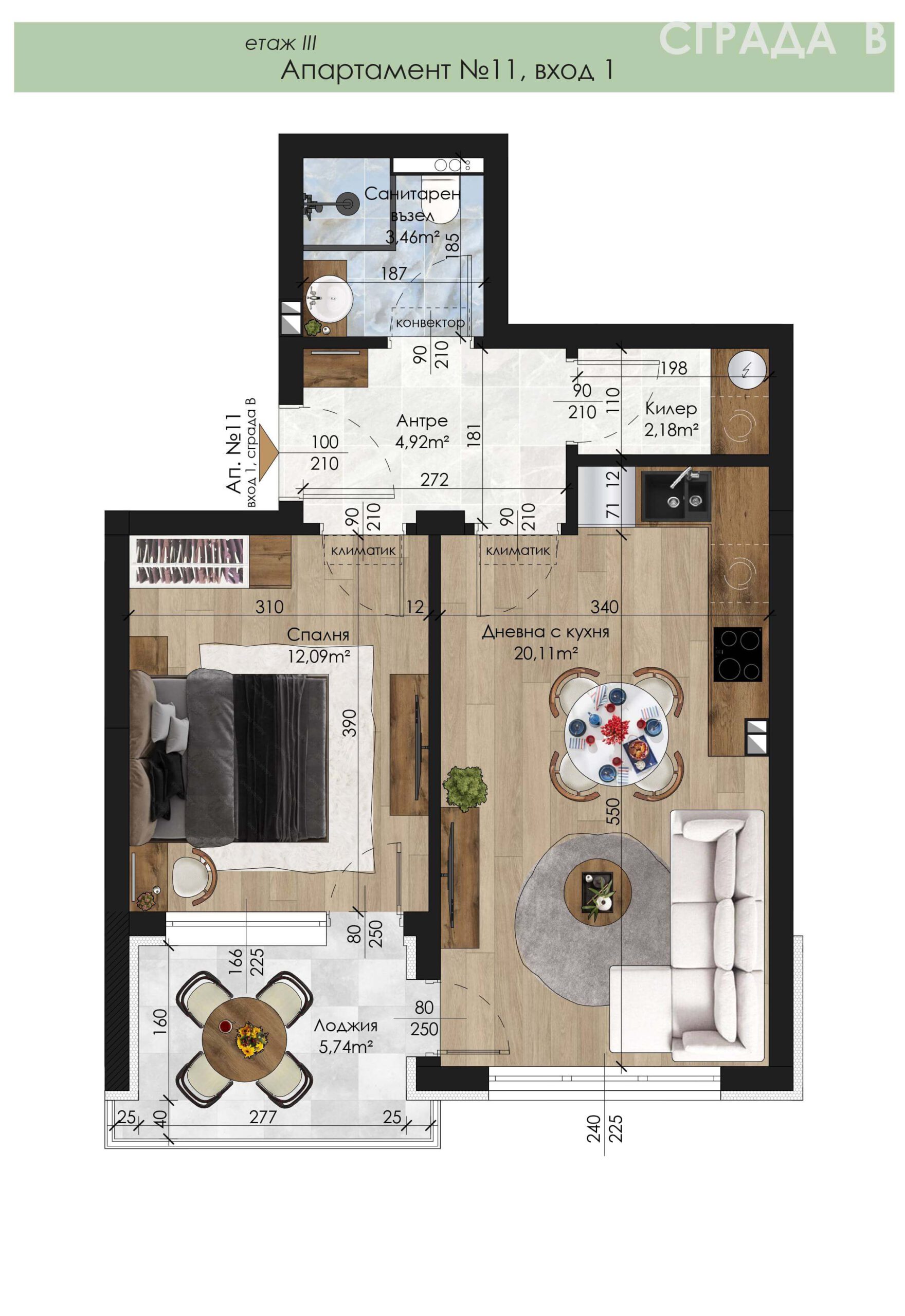 Апартамент – дневна с кухненски бокс, спалня, санитарен възел, килер, антре и лоджия.