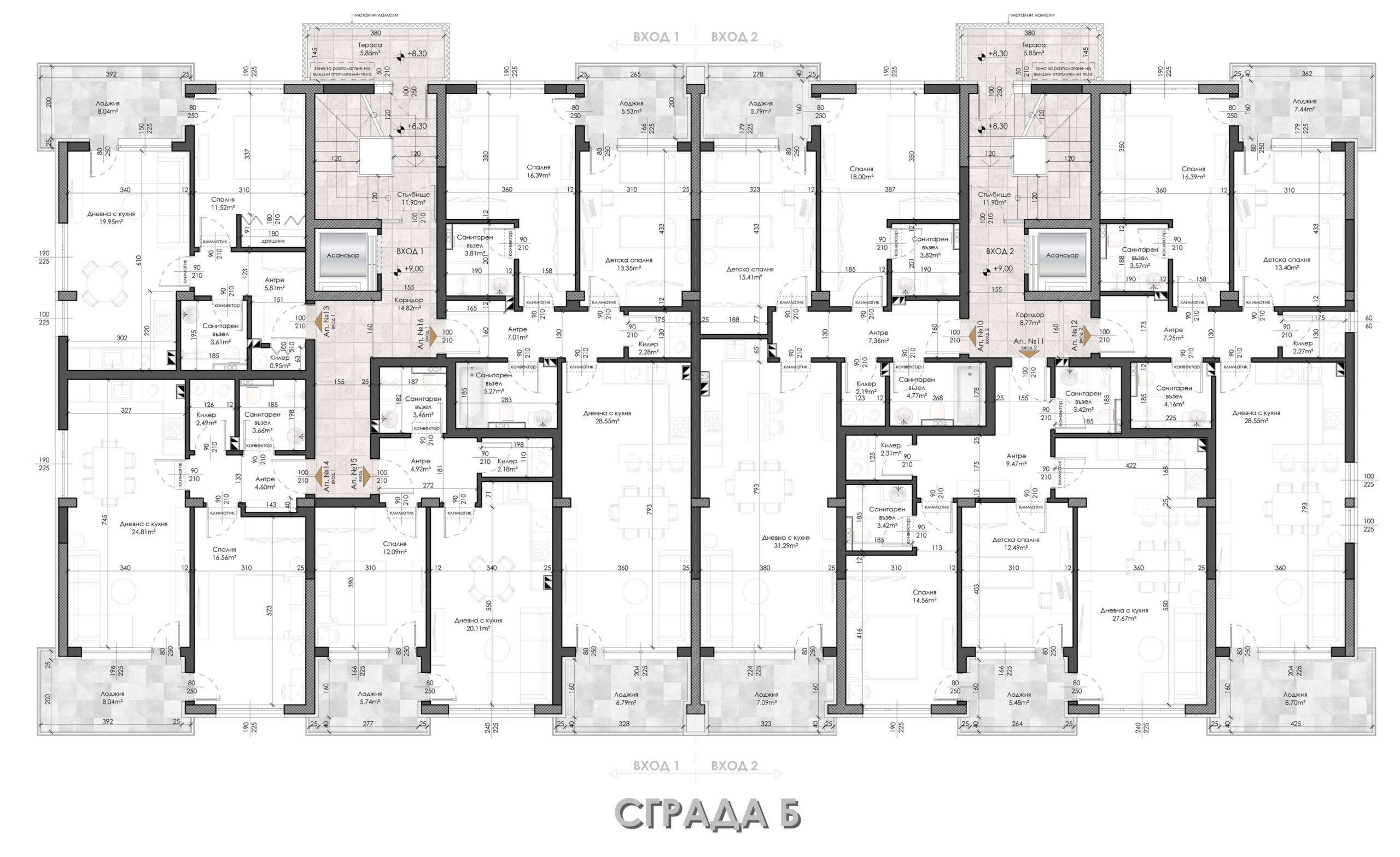 Апартамент – дневна с кухненски бокс, 2 спални, 2 санитарни възела, килер, антре и 2 лоджии.