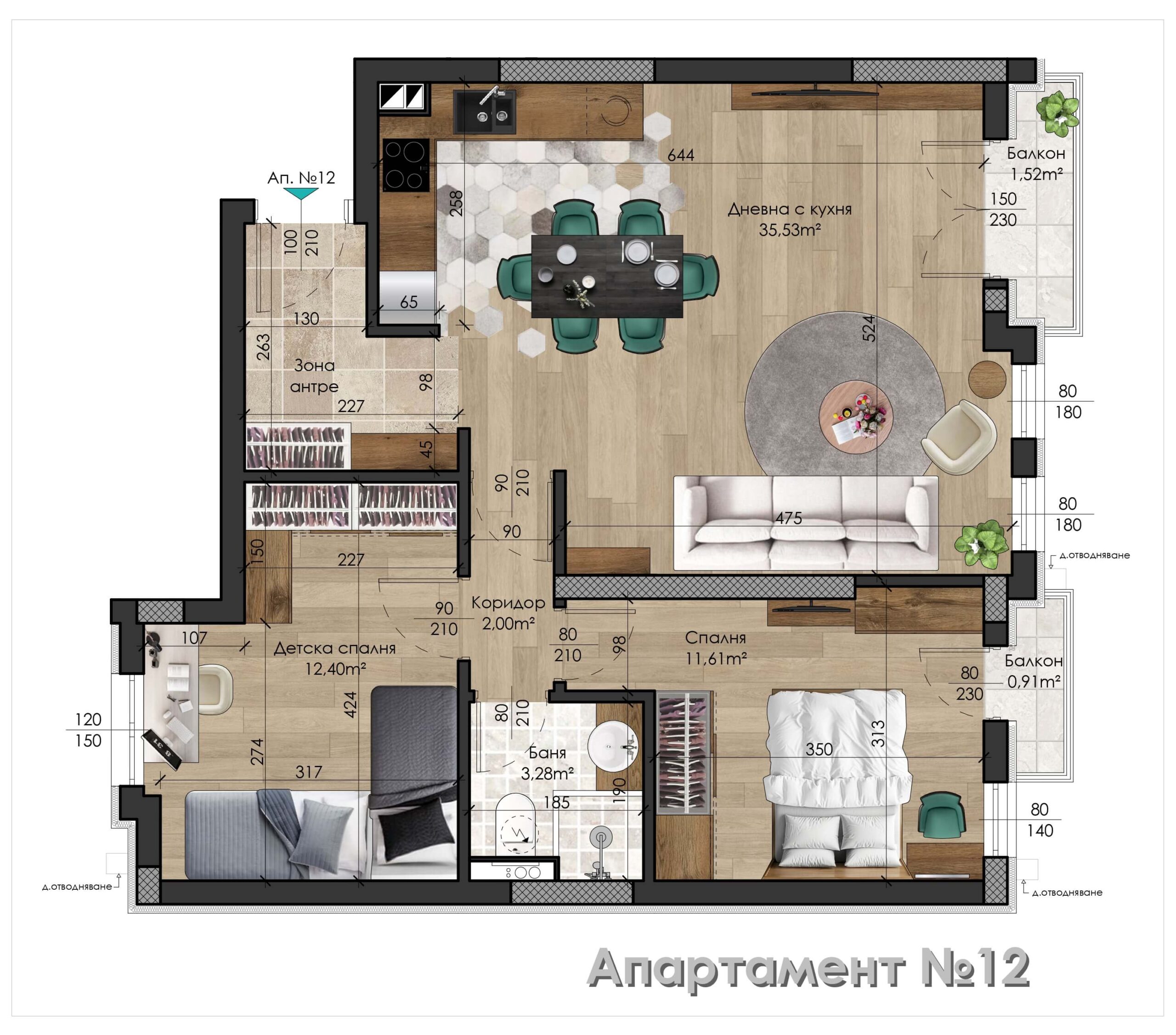 Апартамент – дневна с кухненски бокс, 2 сални, баня с тоалетна, антре и 2 балкона.