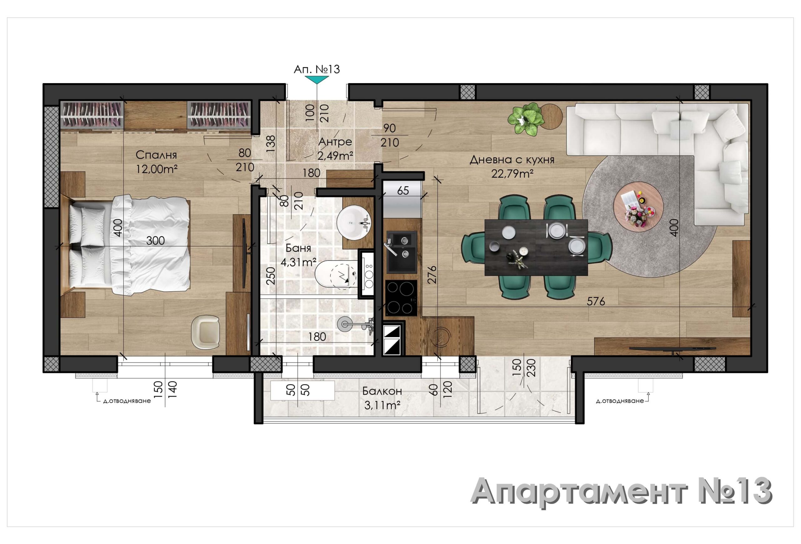 Апартамент – дневна с кухненски бокс, 1 салня, баня с тоалетна, антре и балкон.