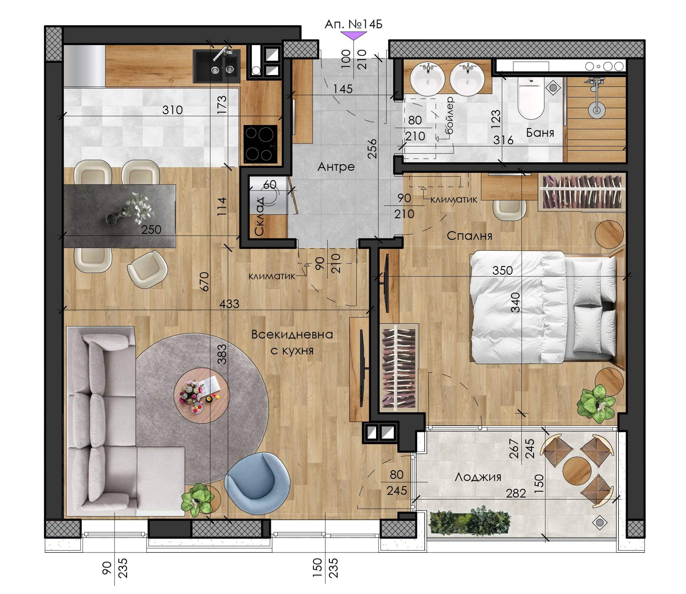 Апартамент- Дневна с кухненски бокс, 1 спалня, баня с тоалетна, склад, антре и лоджия.