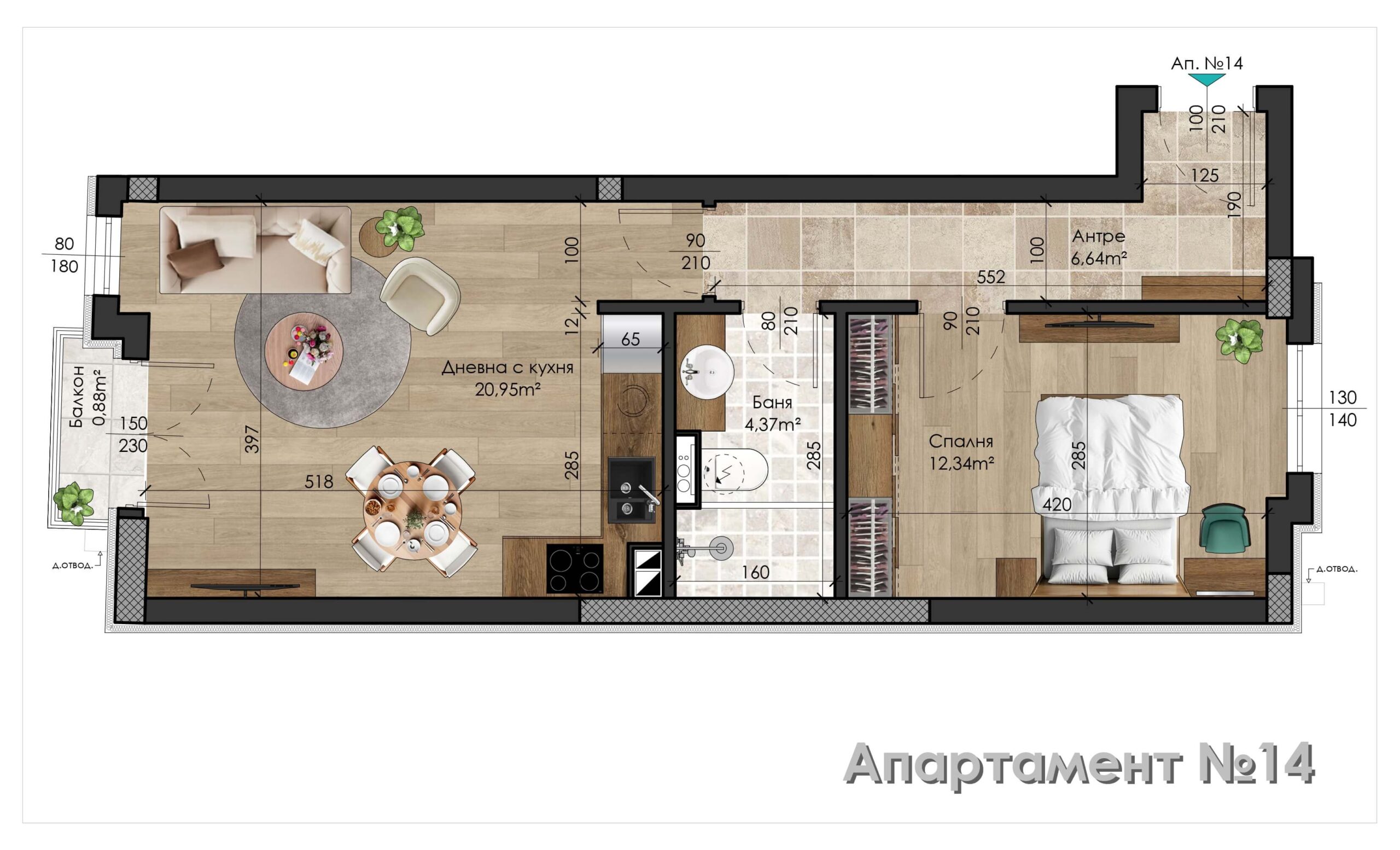 Апартамент – дневна с кухненски бокс, 1 салня, баня с тоалетна, антре и балкон.
