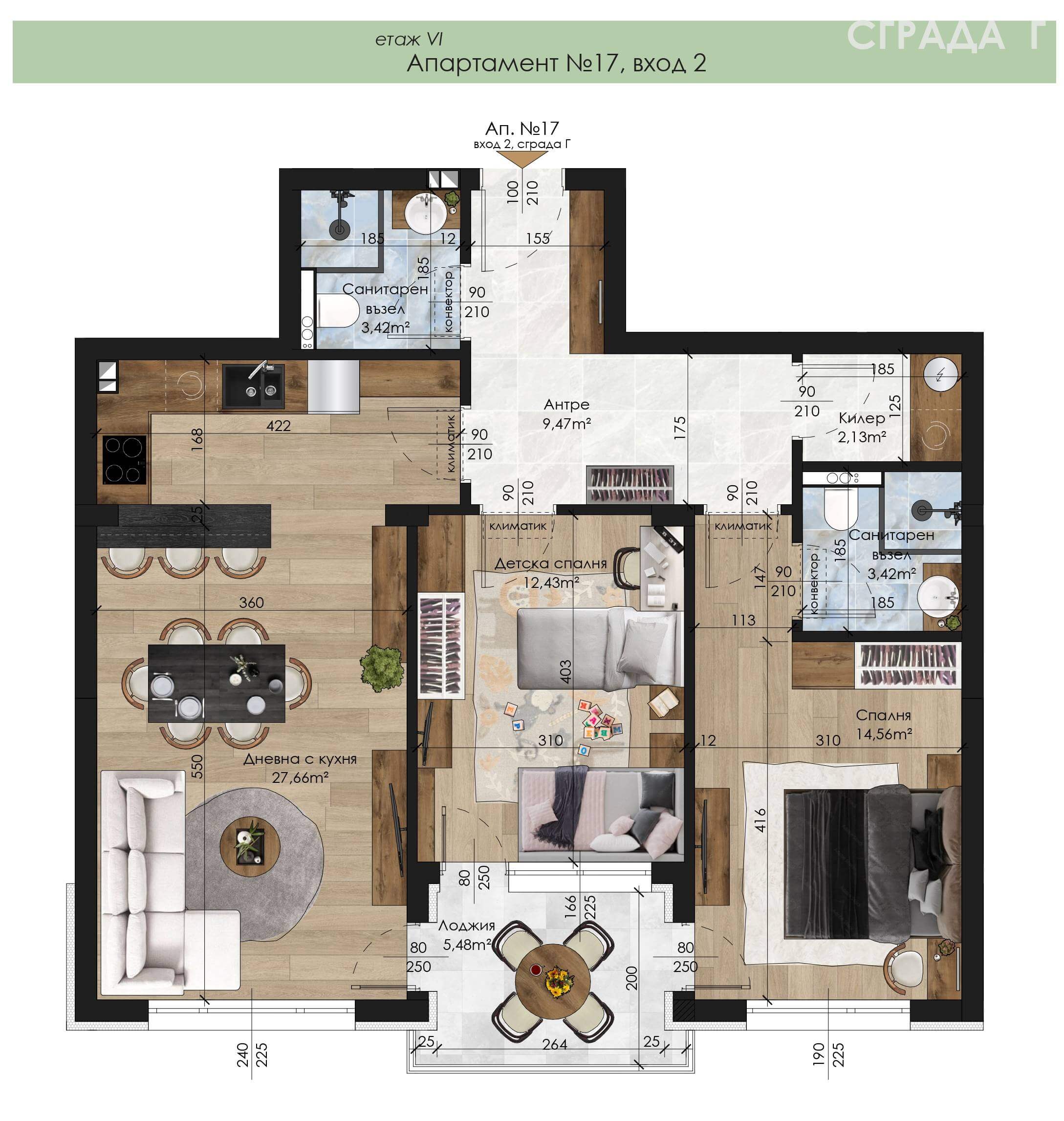 Апартамент – дневна с кухненски бокс, 2 спални, 2 санитарни възела, килер, антре и лоджия.