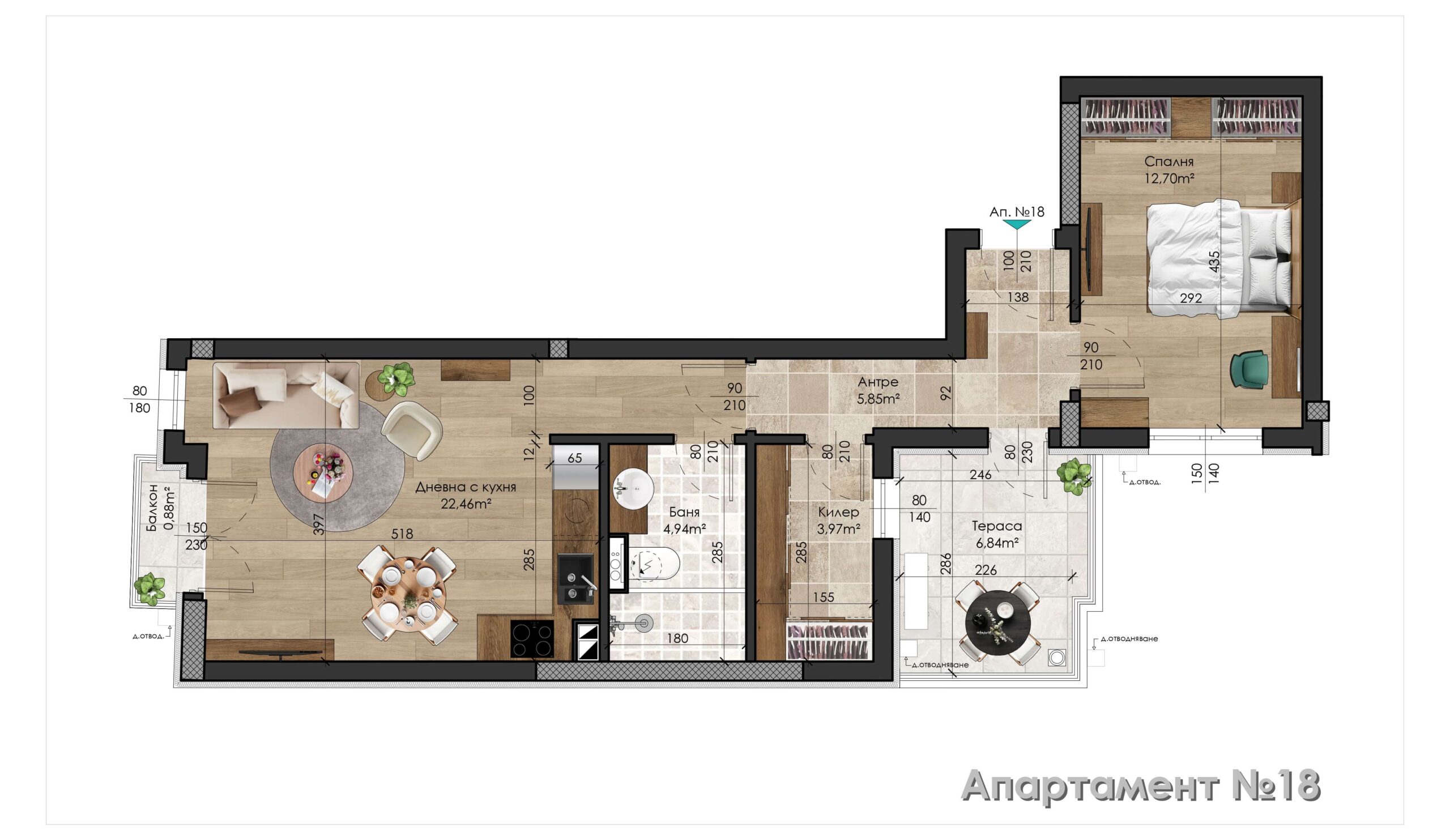 Апартамент – дневна с кухненски бокс, 1 салня, баня с тоалетна, килер, антре, тераса и балкон.
