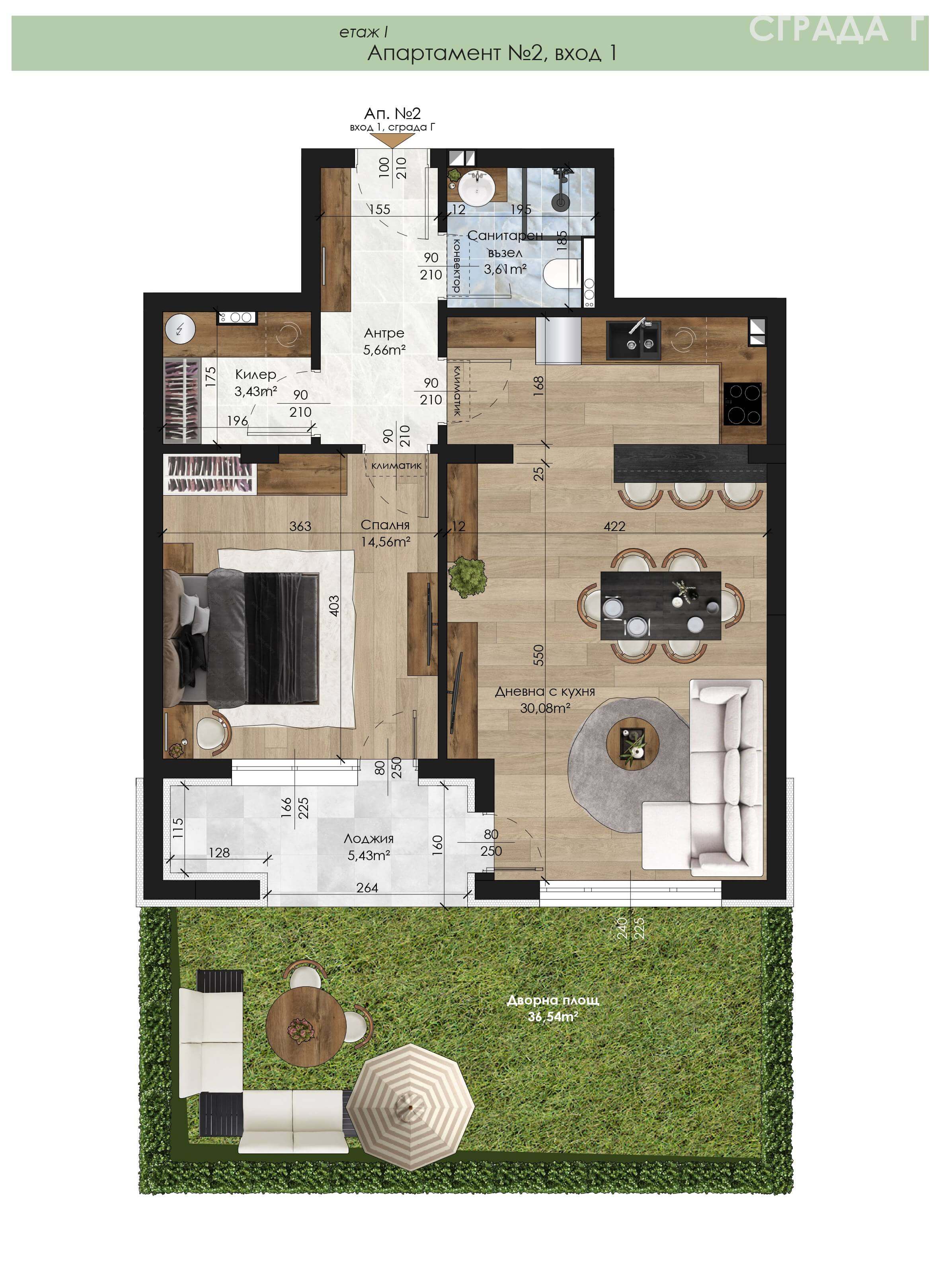 Апартамент – дневна с кухненски бокс, спалня, санитарен възел, килер, антре, лоджия и 36,54 кв.м двор.