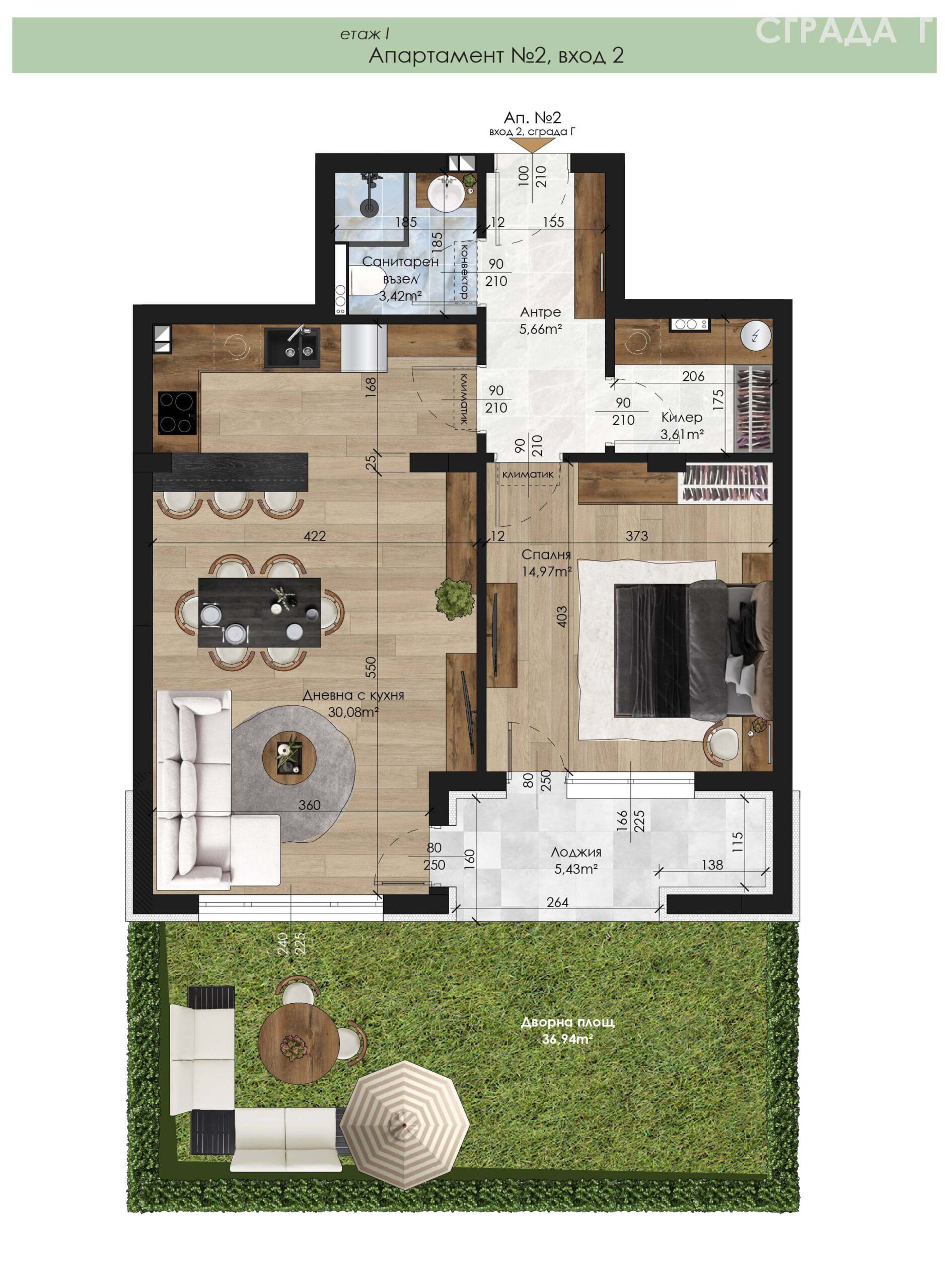Апартамент – дневна с кухненски бокс, спалня, санитарен възел, килер, антре, лоджия и 36,94 кв.м двор.