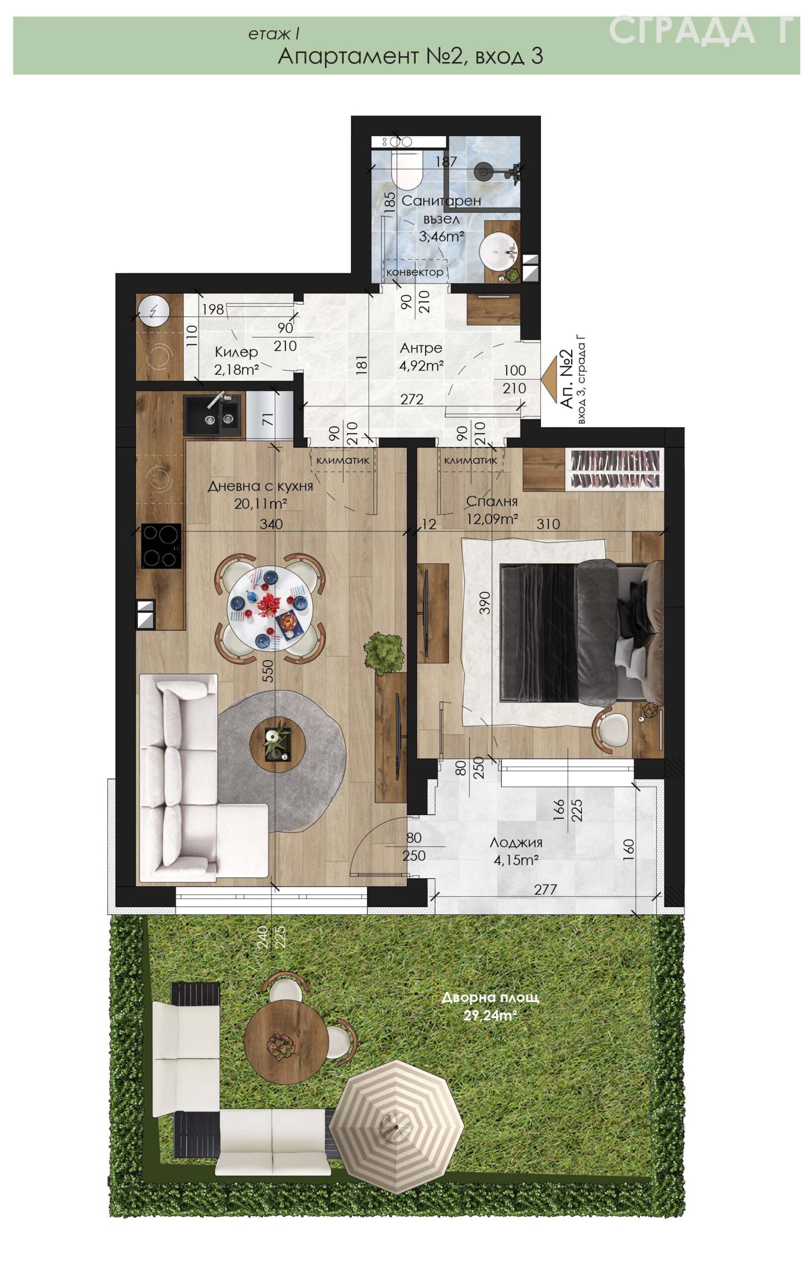 Апартамент – дневна с кухненски бокс, спалня, санитарен възел, килер, антре, лоджия и 29,24 кв.м двор.