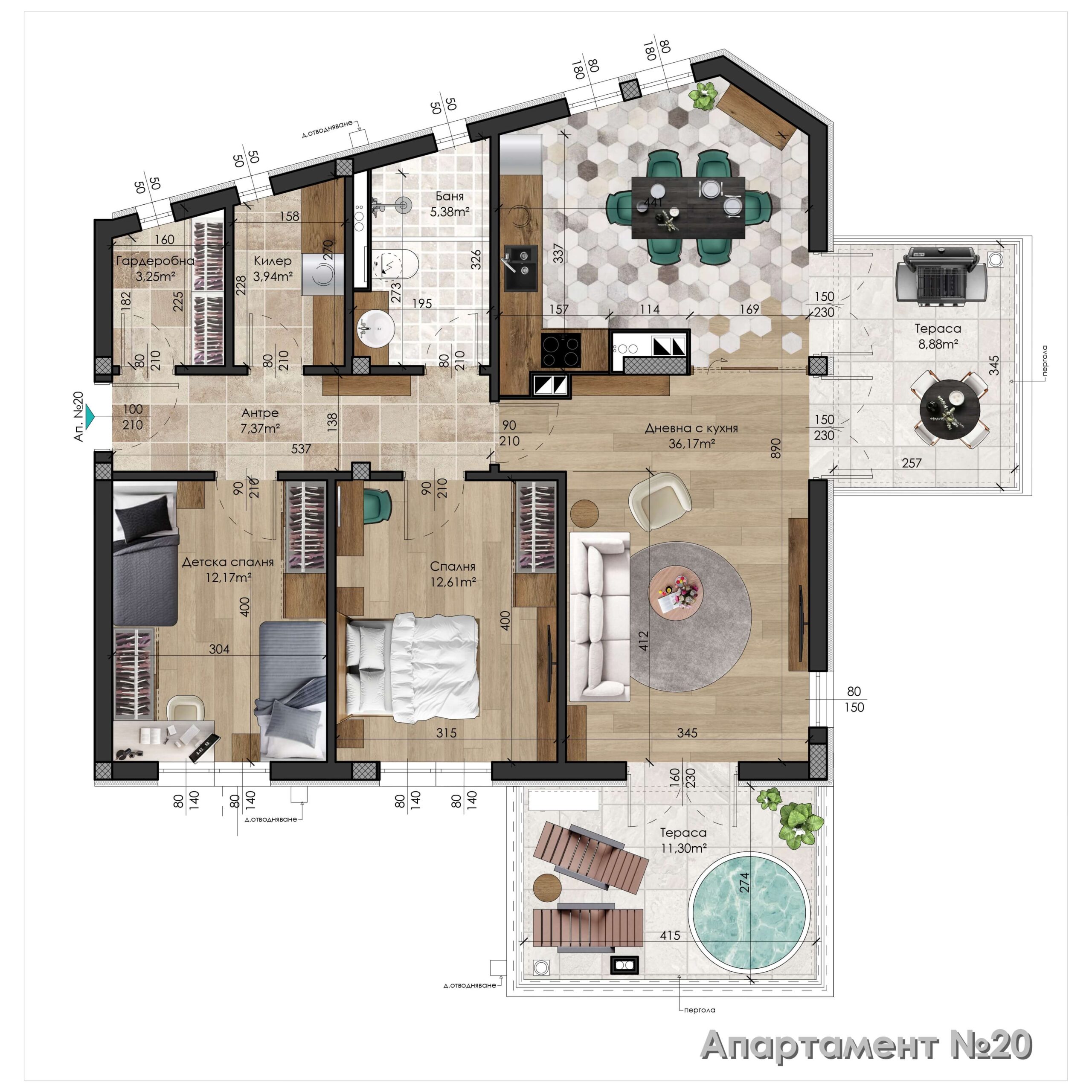 Апартамент – дневна с кухненски бокс, 2 сални, баня с тоалетна, килер, гардеробна, антре и 2 тераси.