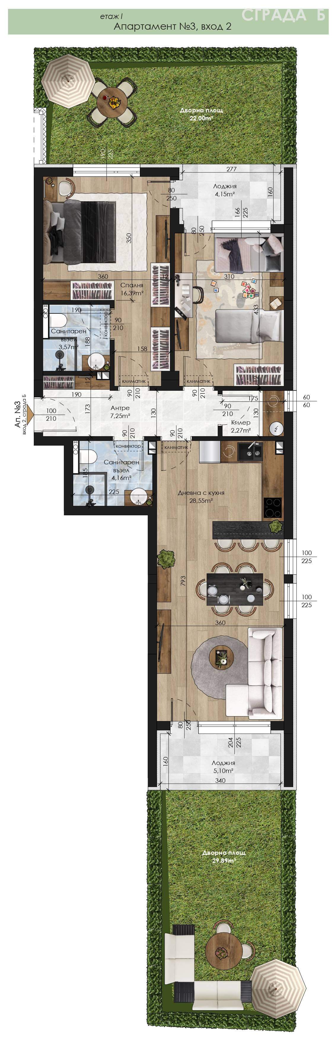 Апартамент – дневна с кухненски бокс, 2 спални, 2 санитарни възела, килер, антре, 2 лоджии и 51,89 кв.м двор.