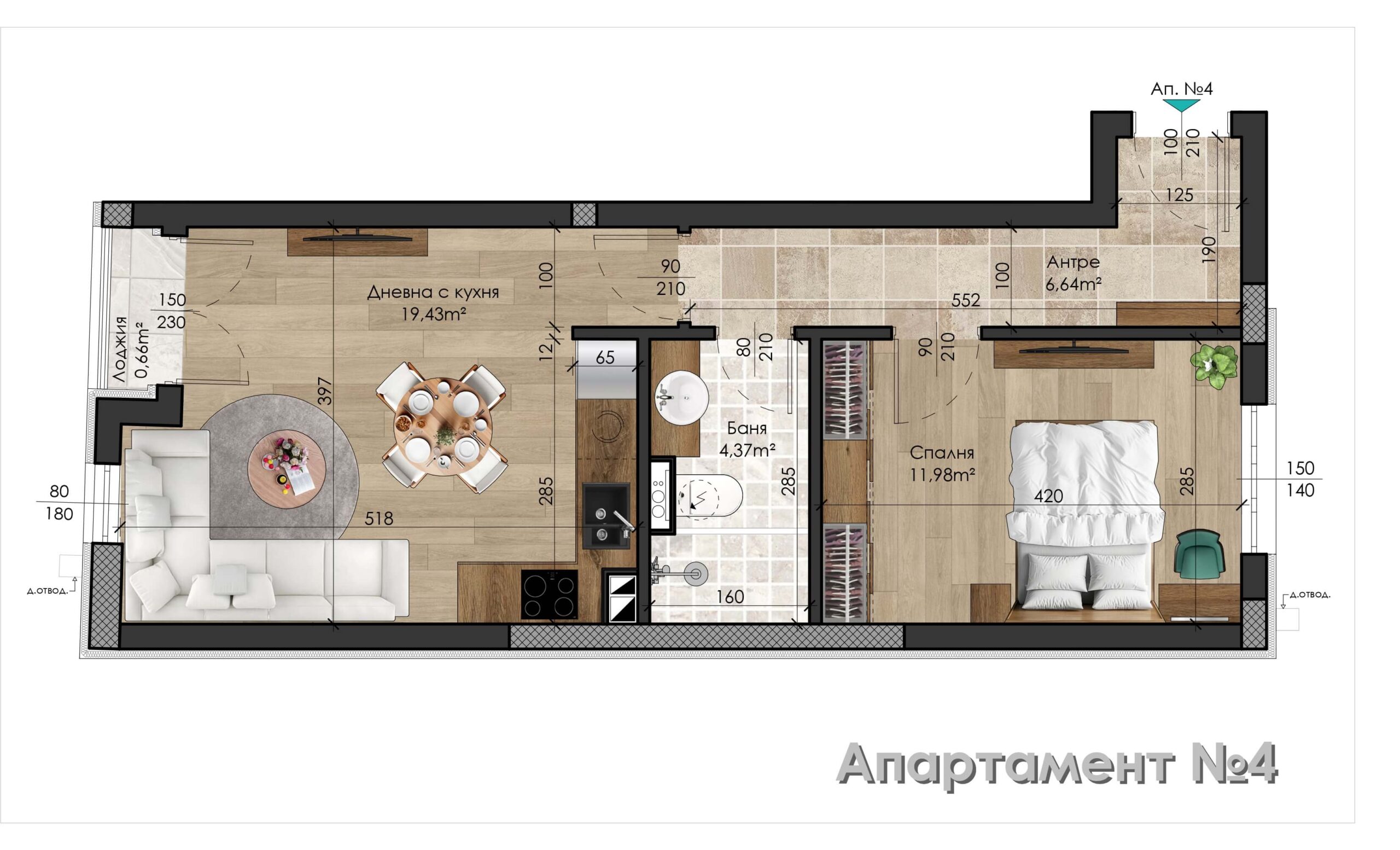 Апартамент – дневна с кухненски бокс, 1 салня, баня с тоалетна, антре и лоджия.