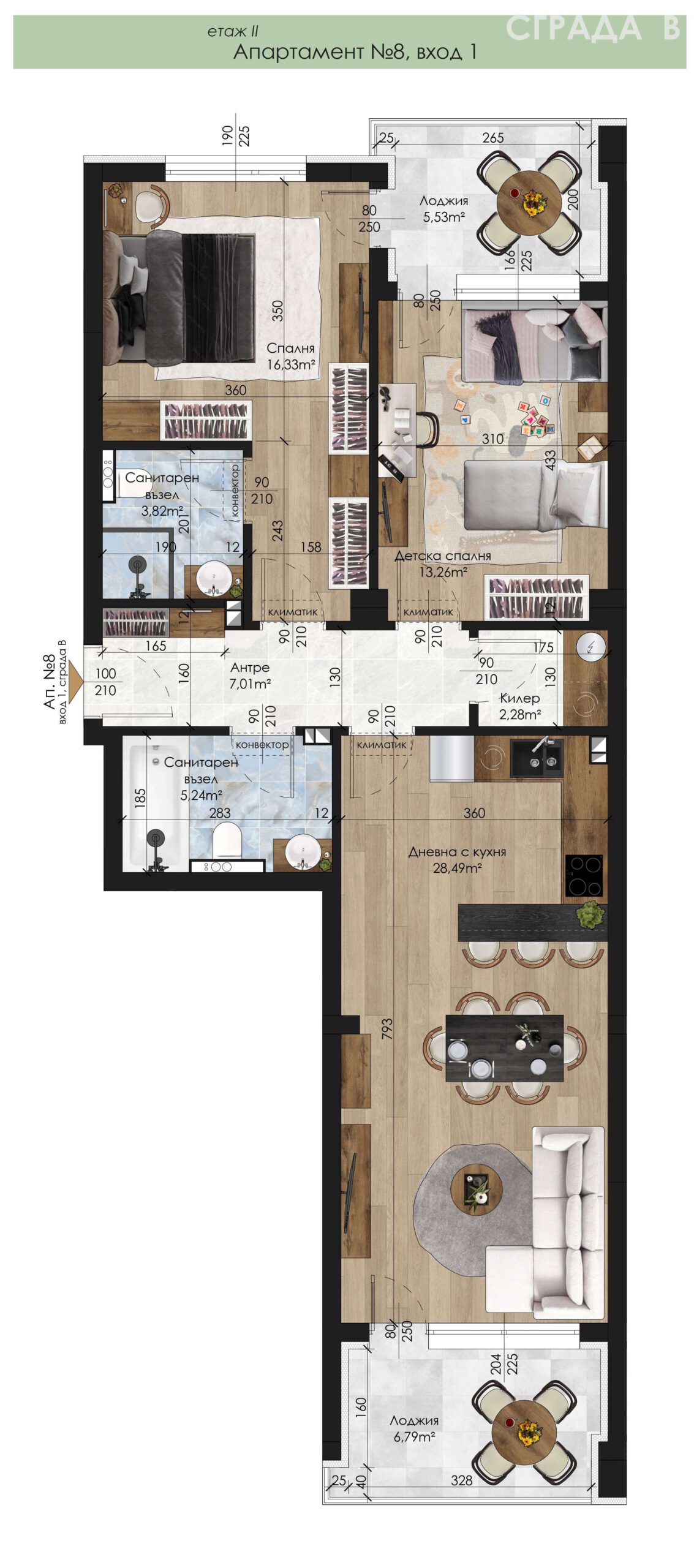 Апартамент – дневна с кухненски бокс, 2 спални, 2 санитарни възела, килер, антре и 2 лоджии.