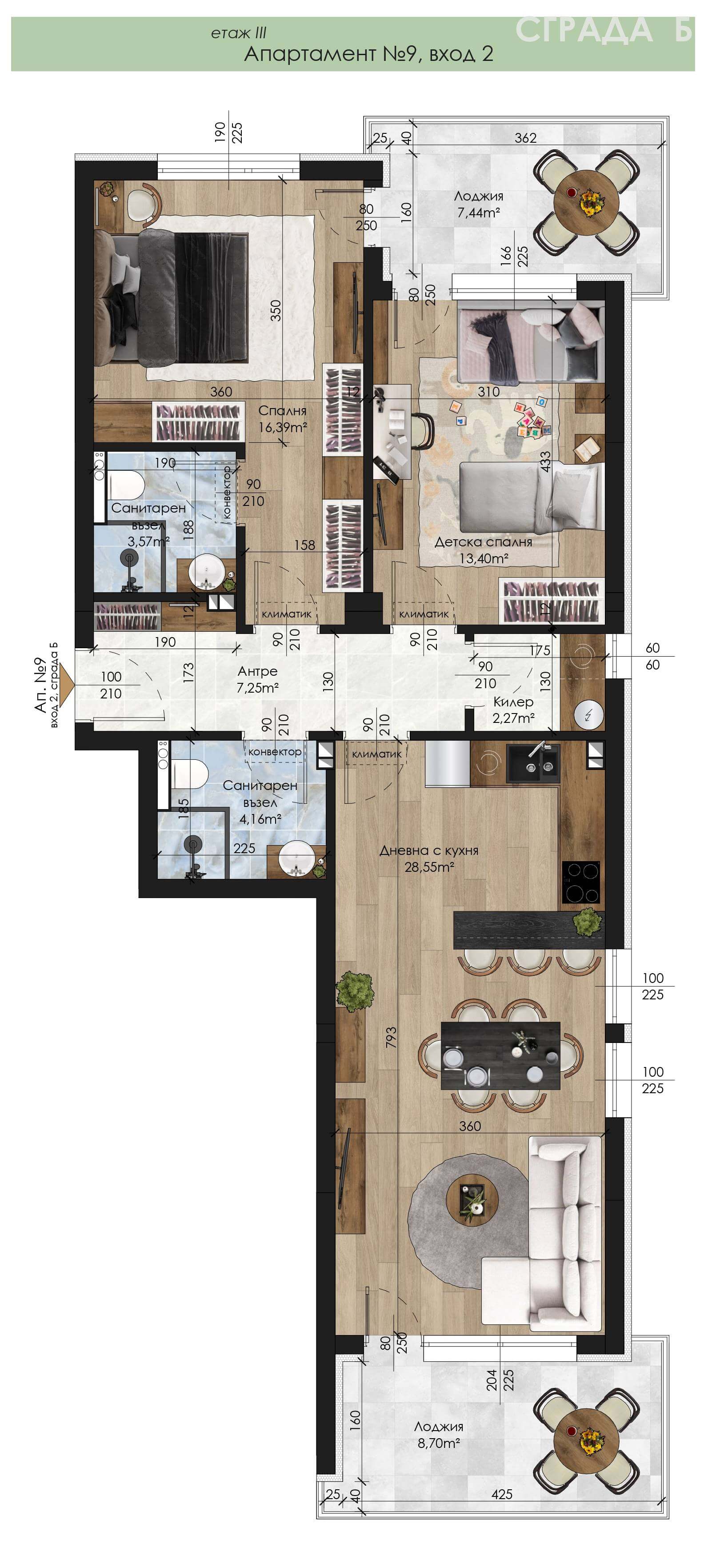 Апартамент – дневна с кухненски бокс, 2 спални, 2 санитарни възела, килер, антре и 2 лоджии.
